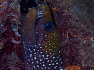 What they don’t seem to realize is that their shelter is most often where the attack is launched from. You don’t have to look too closely at the crevacess and cracks to see them. The groupers lie there innocuously, seemingly somnambulant. Blue line groupers are the most commonly seen though flower groupers and a few others are also relatively common, lounging about warily eyeing you as you pass over their heads. Occasionally one will lose its nerve when you come too close and flash into the depths of the reef, showing remarkable acceleration for what seemed like a sleepy fish.
